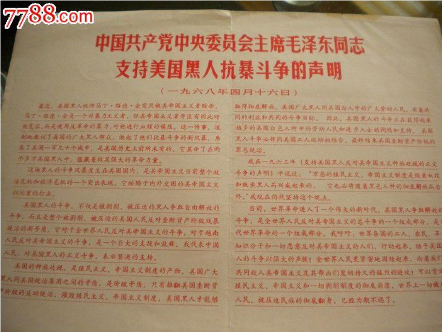 《中国共产党中央委员会主席毛泽东支持美国黑人斗争的声明》发表。