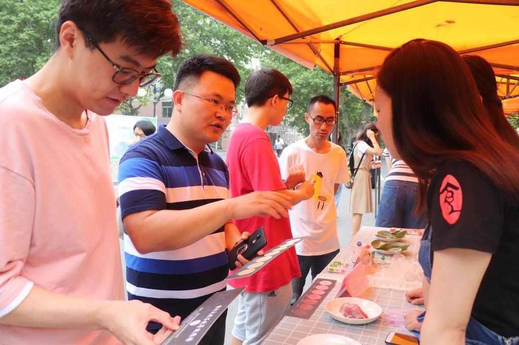 活动过程中,讲解员在玉兰路边摆放的展板旁对肉、酒、奶制品、食用菌的知识进行讲解,对公众关注的注水肉、注胶肉等做了详细解读,这类肉是往猪肉里人为添加水,卡拉胶、黄原胶等食用胶,严重危害健康;另介绍了辨别常见酒品、乳品的方法,并在帐篷内的产品展示区由工作人员展示蒸馏酒、发酵酒、配制酒等酒类,以及牛奶,酸奶,乳饮料等乳制品,在工作人员的讲解下,相信师生都掌握了一招鉴别的秘籍;食用菌是公众相对陌生的板块,讲解员从食用菌主食加工产品、食用菌休闲即食产品、食用菌风味调味品、食用菌功能产品四个部分进行讲解,在一旁的产品展示区也分别准备了相应的具有代表性的食品,如发芽糙米全营养棒,帮助师生进一步加深对此类产品的了解。