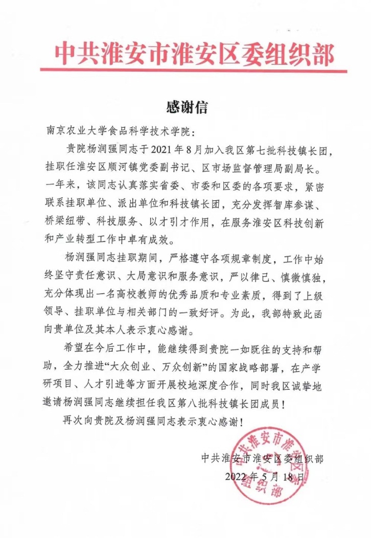 近日,中共淮安市淮安区委组织部为我院杨润强同志发来感谢信。2021年8月,杨润强同志入选江苏省淮安市第七批科技镇长团,挂职担任淮安区顺河镇党委副书记、区市场监督管理局副局长。一年来,杨润强同志深入走访全区农业和食品加工企业,为农产品加工企业提供技术指导;邀请第一版主