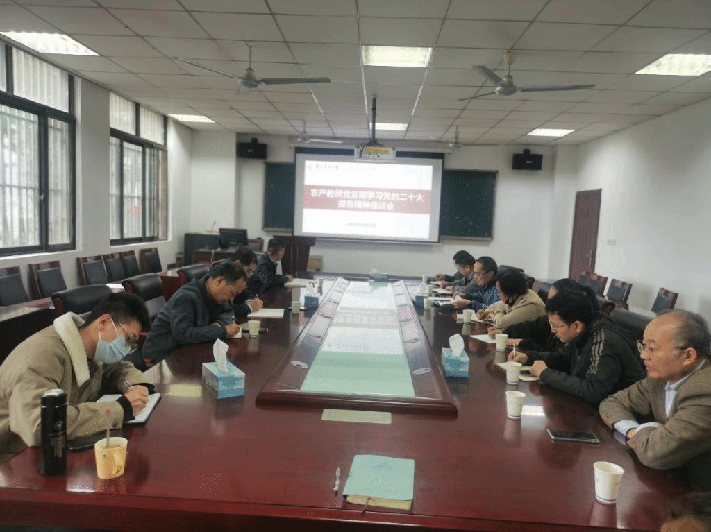党的二十大是在全党全国各族人民迈上全面建设社会主义现代化国家新征程、向第二个百年奋斗目标进军的关键时刻召开的一次十分重要的大会。连日来,农产教师支部党员采取不同形式认真学习了党的二十大报告和习近平总书记重要讲话精神。会上,潘磊庆带领党员们回顾了党的二十大报告的十五个方面。紧接着,各位党员从不同的角度畅谈了个人学习党的二十大报告的心得体会,以及未来的努力目标和方向。支部各位党员一致表示,要把学习宣传贯彻党的二十大精神作为首要政治任务,深刻领会党的二十大精神实质,牢牢把握核心要义。全面贯彻习近平新时代中国特色社会主义思想,弘扬伟大建党精神,牢记空谈误国、实干兴邦,沉下心来扎根专业,为全面实现中华民族伟大复兴的贡献力量。