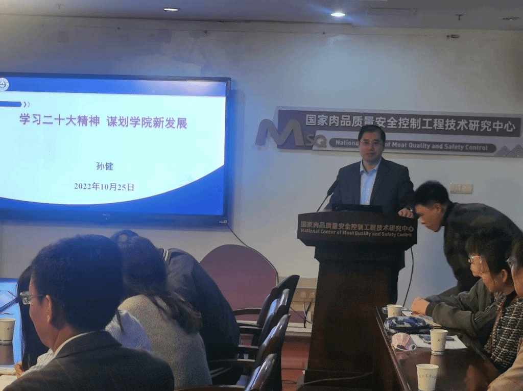 党委书记孙健结合党的二十大精神学习,于10月26日——27日,在肉品中心会议室及学院220会议室分别给学院四个教师党支部党员做“学习党的二十大,谋划学院新发展”的微党课。
