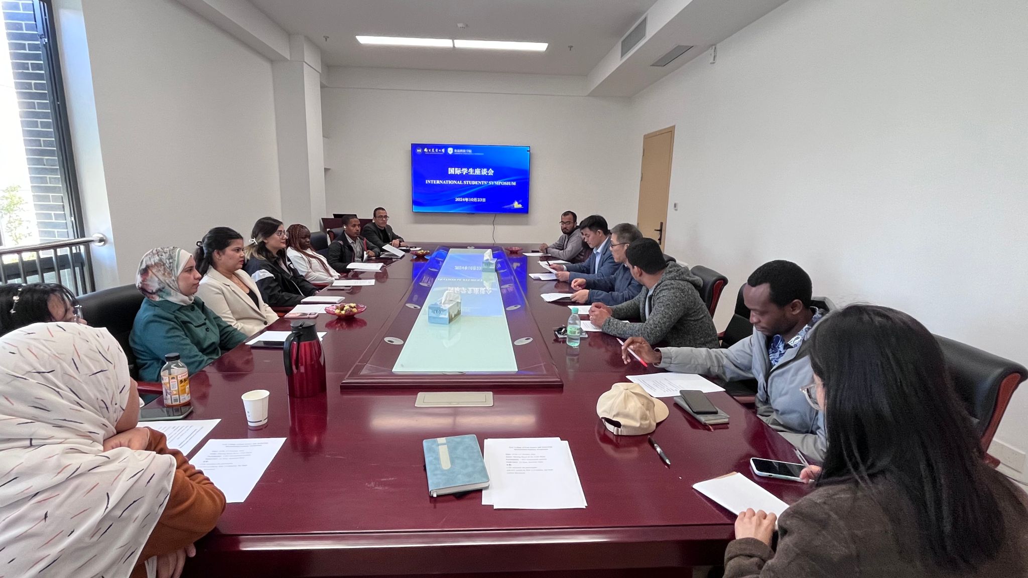 召开国际学生座谈会。来自巴基斯坦、埃及、印度尼西亚、肯尼亚等国家的在校本硕博国际学生参加了会议。