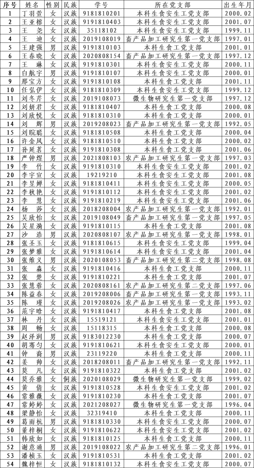 根据《中国共产党章程》、《中国共产党发展党员工作细则(试行)》的有关规定,经团支部推优、入党介绍人谈话考察、学生党支部答辩和投票表决、学校及学院党组织一年以上的线上和线下系列培训教育,以及对发展对象的志愿服务、任职经历、科研水平、学业成绩、创新能力等的综合考察,现拟将丁羽萱等 54 位同志确定为党员发展对象。现将具体名单公示如下(按姓氏笔画排序):