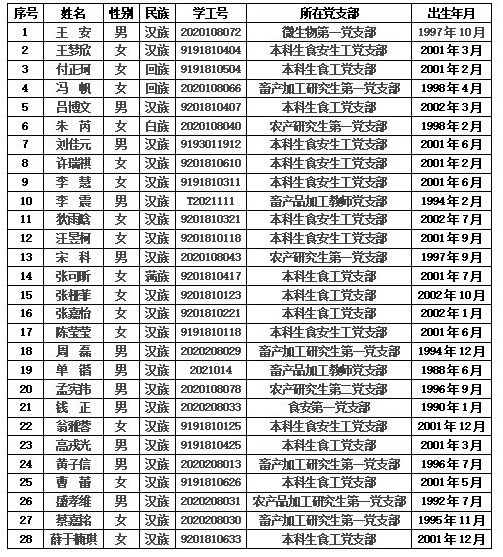 根据《中国共产党章程》、《中国共产党发展党员工作细则(试行)》的有关规定,经团支部推优、入党介绍人谈话考察、学生党支部答辩和投票表决、学校及学院党组织一年以上的线上和线下系列培训教育,以及对发展对象的志愿服务、任职经历、科研水平、学业成绩、创新能力等的综合考察,现拟将王安等 28 位同志确定为党员发展对象。现将具体名单公示如下(按姓氏笔画排序):