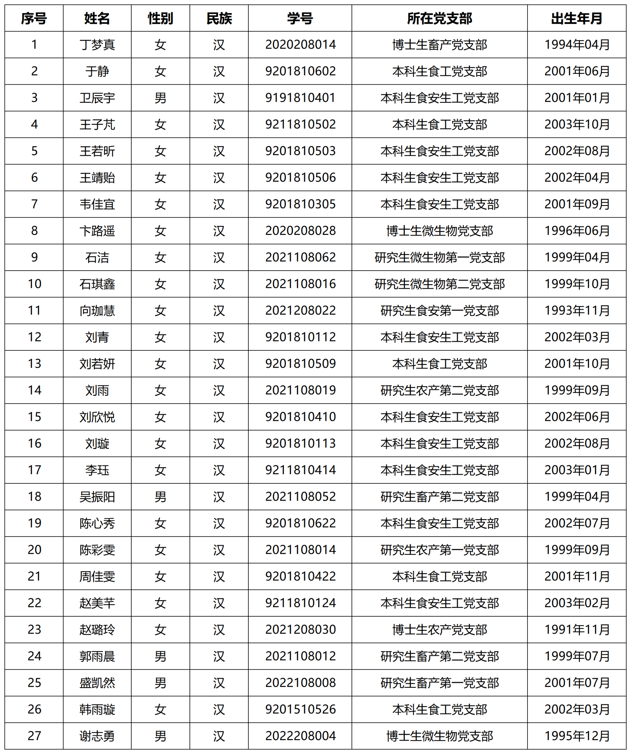根据《中国共产党章程》、《中国共产党发展党员工作细则(试行)》的有关规定,经团支部推优、入党介绍人谈话考察、学生党支部答辩和投票表决、学校及学院党组织一年以上的线上和线下系列培训教育,以及对发展对象的志愿服务、任职经历、科研水平、学业成绩、创新能力等的综合考察,现拟将丁梦真等 27 位同志确定为党员发展对象。现将具体名单公示如下(按姓氏笔画排序):